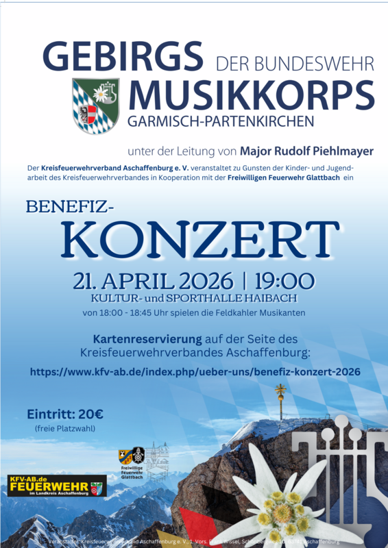Der Kreisfeuerwehrverband Aschaffenburg e.V. veranstaltet zu Gunsten der Kinder- und Jugendarbeit des Kreisfeuerwehrverbandes, in Kooperation mit der Freiwilligen Feuerwehr Glattbach, ein Benefizkonzert am